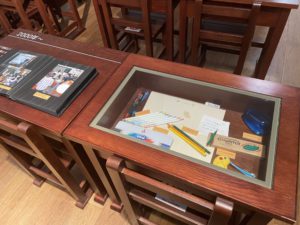 この机の中に各年代で使用されていた懐かしい学校用具が展示されています。
