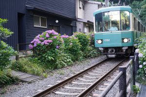 江ノ電長谷駅から歩いて10分程の場所にある神社です。ここは、あることで有名なあじさいスポットですが、それは、神社のすぐ脇を江ノ電が走っているということです。ですので、線路を背景にしたり、江ノ電と一緒にあじさいの写真を撮ることが出来ます。