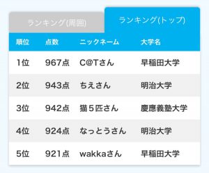 順位に関しては、トップ5と自分の周りの学生の順位も見ることができます。