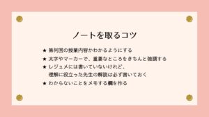 それでは本題の、勉強面でも充実した大学生活を送るコツ①、ノートの取り方です。