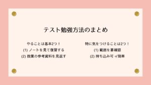 テスト勉強の基本は、(1) ノートを見て復習する、(2) 授業の参考資料を見返すことです。