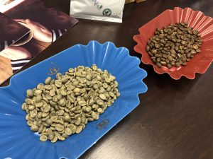(写真の右が焙煎豆、左が生豆)