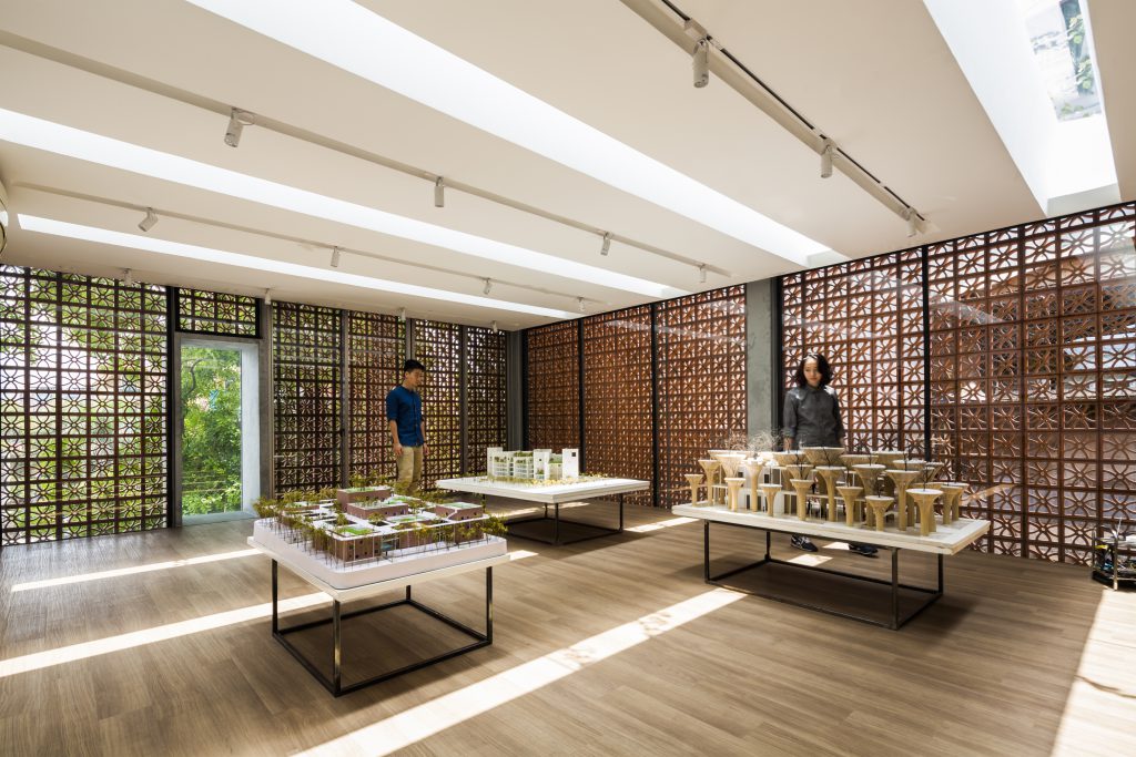 建物の前に立つ、一本の大きな街路樹をデザインの一部として捉えて設計に取り組んだ照明ショールーム兼ギャラリー。建物はベトナムの伝統的な建築製品である有孔テラコッタ・ブロックを垂直に積み上げ、光と風を透過するスキンをもつ単純で抽象的なヴォリュームとしている。