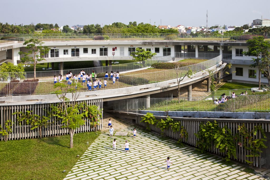 靴工場で働くワーカーの子どもたち500人のための幼稚園。リング状の屋上庭園は子どもたちの活動を最大化しながら、菜園として使われ農業の学びをもたらす場となっている。
