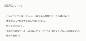 哲学対話のユニークポイントは二つあります。一つは普段話せないことをがっつり話せるっていうこと、もう一つは「対話のルール」があることです。