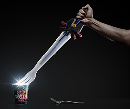 歴代のプロデューサーが選んだシリーズ1から15までの最強の敵キャラをプリントし、「空腹は最強の敵だ!」というキャッチコピーでオリジナルデザインのカップヌードルを作りました。
