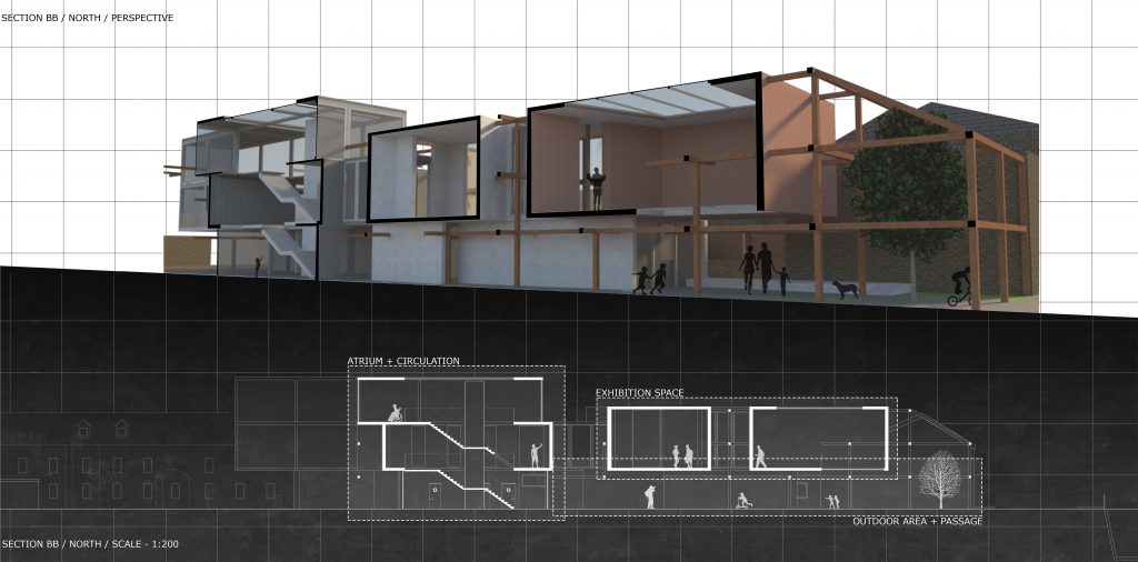 A Sculptural Art Exhibition, Gallery and Community Space Through analysing negative events that take place within Sincil Bank, the project is not only designed to function as an art exhibition and community centre, but also act as a positive outdoor ‘passage’. The requirements include the passage to flow inside the building spatially and materially, being light filled and circulate pedestrians deeper into the neglected residential area.