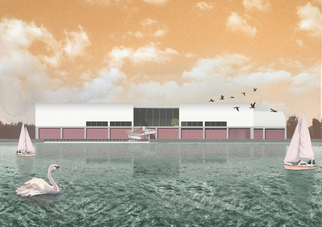 The Bathhouse is a proposal forming a new paradigm for bathing. Situated along the River Clyde in Glasgow, it aspires to embrace and envision the river’s future as an important aspect of the city like how it used to be in the past.A view of the Spa pools and the courtyard on the first floor of the Bathhouse. Both optimising the views of the River Clyde.