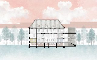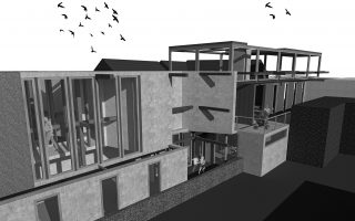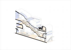 The building sits on a long and narrow site. To achieve an open and bright space I have decided to elevate the spaces vertically to have more of free plan. By doing this I can also activate the area below and provide visual connection. The interior almost detaches itself from the envelope of the site by seeking to transform and extend the perception of the site.