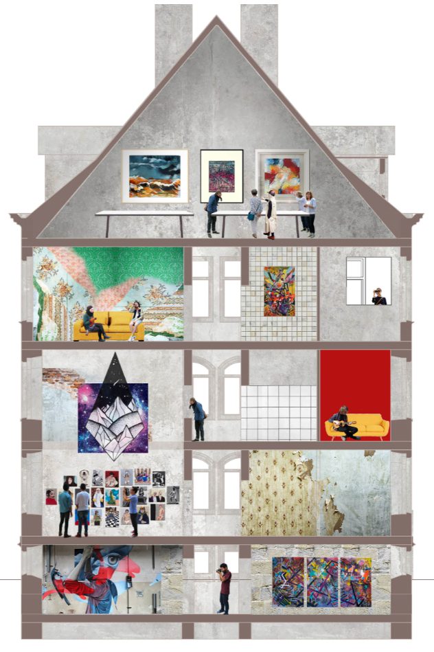 This is one of the projects from the educational process. The theme was: “Building redevelopment”. We had to redesign an old building, formerly a residential building, and give it a new life. We (I and my partner) have designed an art center, a meeting place for artists. The main idea for our project was to preserve the building’s details as much as possible, even including the wallpapers. This is in order to let visitors plunge into the building’s history, reflect on what used to be here and how people lived.