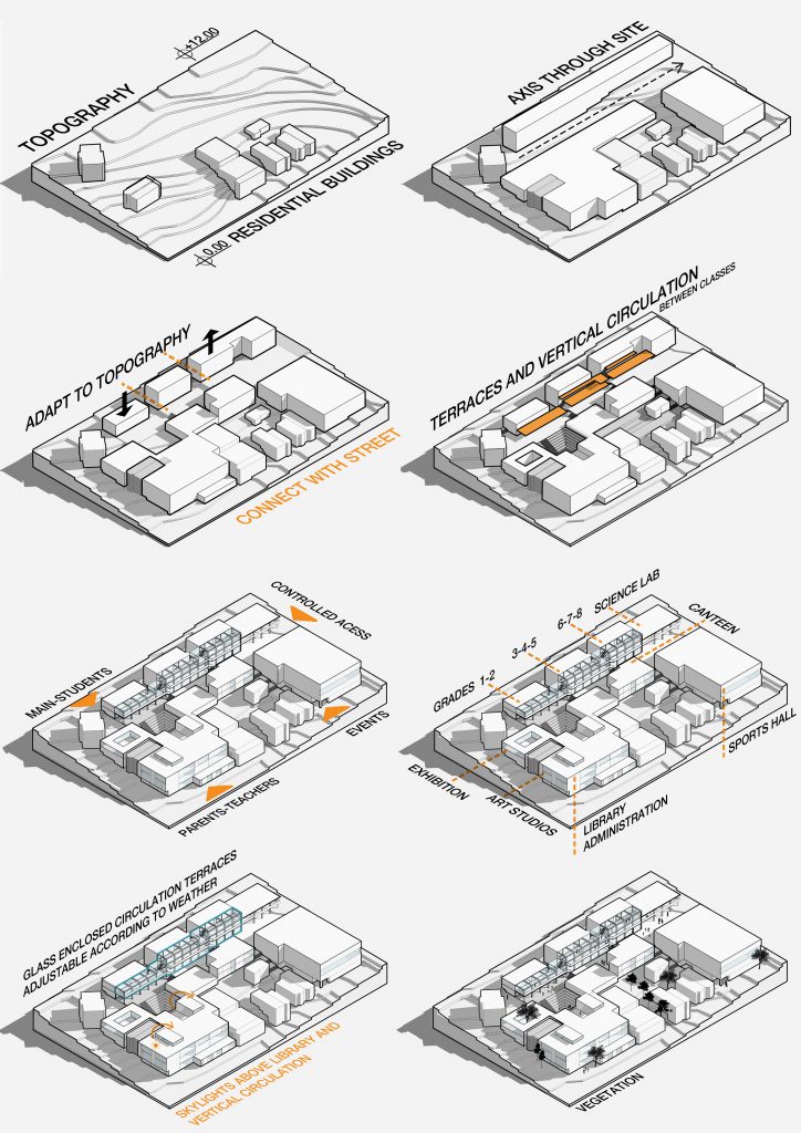 Elementary school in a residential neighborhood The project started with a study of a master plan of the Bosphorus village of Emirgan, analyzing the street planning patterns, historical and urban development of the area and building-terrain relationship. The school is divided into several blocks instead of a large building, taking into consideration the building pattern of the area and the scale of the school through the perspective of children. Inspired by Plato’s Academia and elements of ancient Greek cities (agoras and stoas), it includes a gathering point and a path along with the classes and other amenities such as the library and cafeteria.